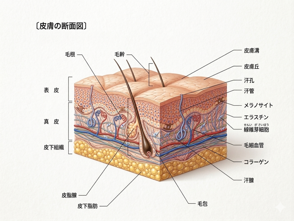 ヒトの皮膚は外側から表皮・真皮・皮下組織の3層。全身平均の厚さはおよそ約2mm前後(部位差あり)。皮膚は体を外界の刺激から守り、見た目の美しさにも直結します。