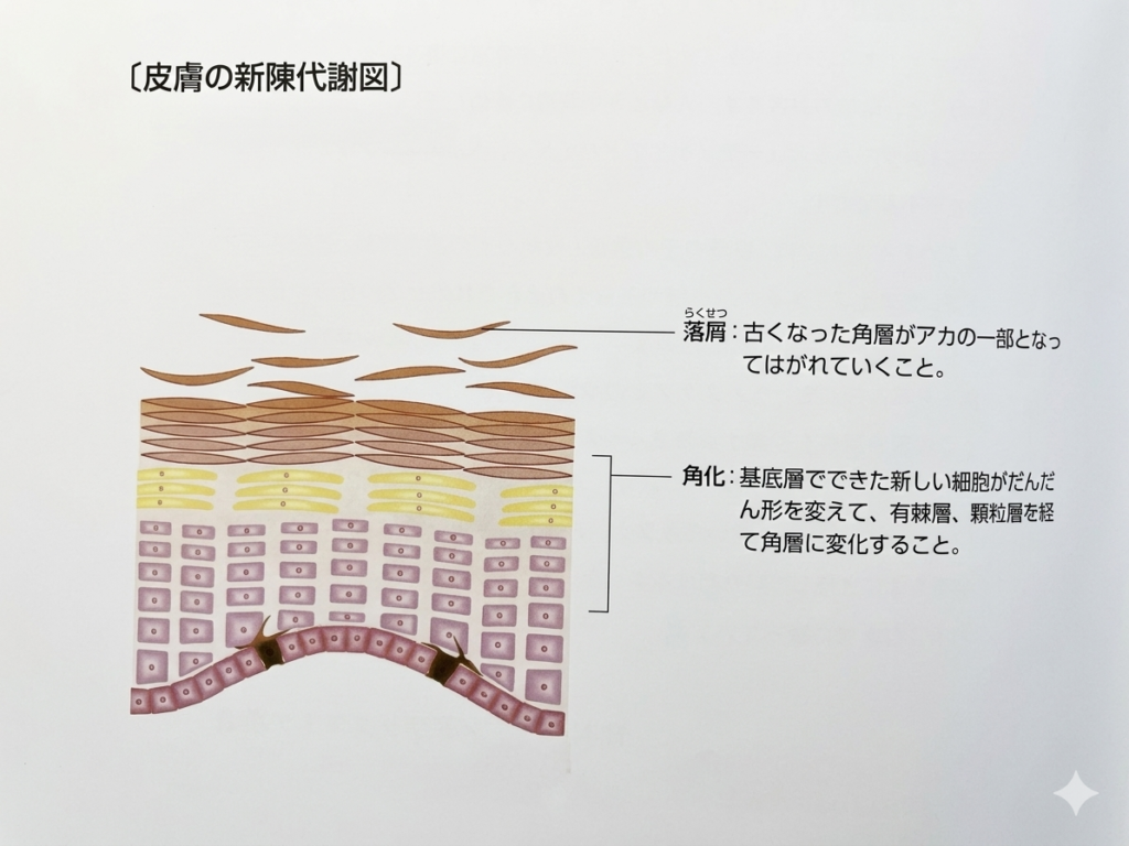 表皮はおもに基底層 → 有棘層 → 顆粒層 → 角層の順に積み重なっています。基底層で生まれた細胞が少しずつ押し上げられ、角層に到達。その後は垢として自然に剥がれ落ちます(落屑)。