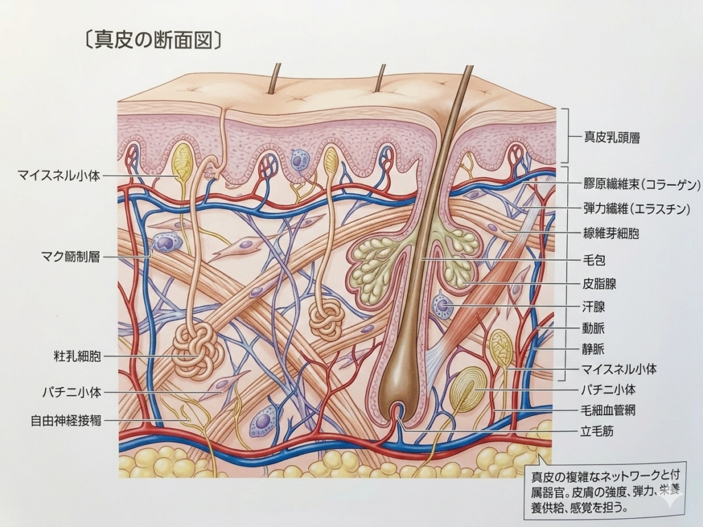 - 真皮:ハリ・弾力を作る“土台”。コラーゲン・エラスチンが主役