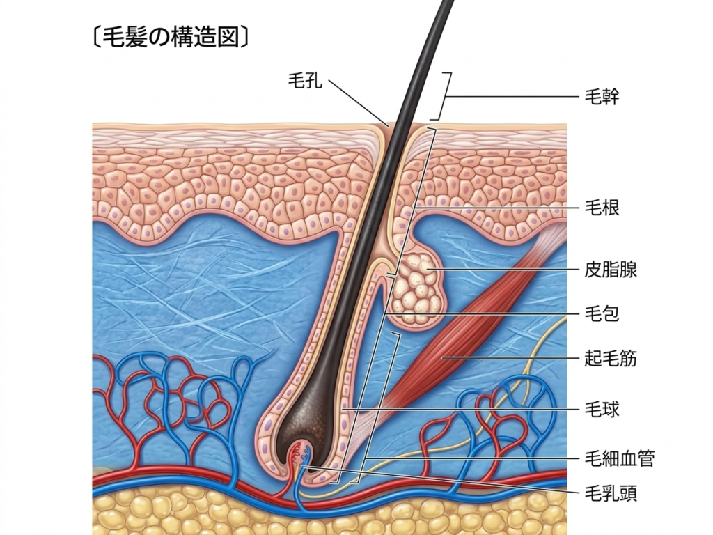 毛髪は皮膚表面に出ている毛幹と、皮膚内の毛根・毛包からなります。毛根の底には毛乳頭があり、血流から栄養を受け取ります。色は色素形成細胞(メラノサイト)の働きによります。